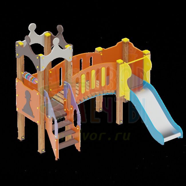 Детский комплекс Тип3 декорирован как маленький замок для принцесс! здесь есть горка со скатом 750 см и турником, лесенка и мостик с поручнями. На башне установлены счеты.
