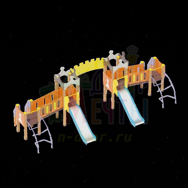 Детский городок Крепость Тип11 состоит из двух игровых модулей, объединенных аркой с украшением в виде крепости. Здесь использованы две горки, каждая высотой 1м и две небольших лестницы. Такая Крепость порадует прежде всего, ребят 3-8 летнего возраста.
